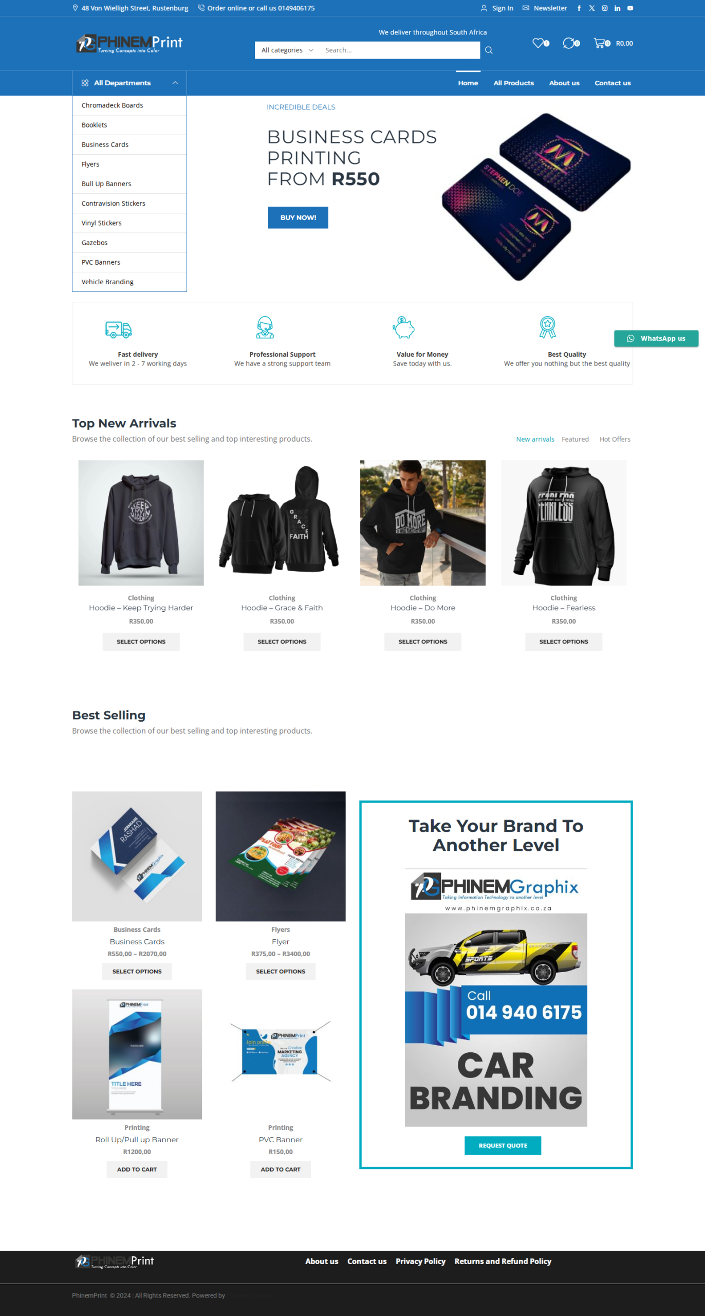 We do printing for Flyers, Posters, Boards, Banners, Car branding, Business Cards, Booklets, Stickers and shop branding